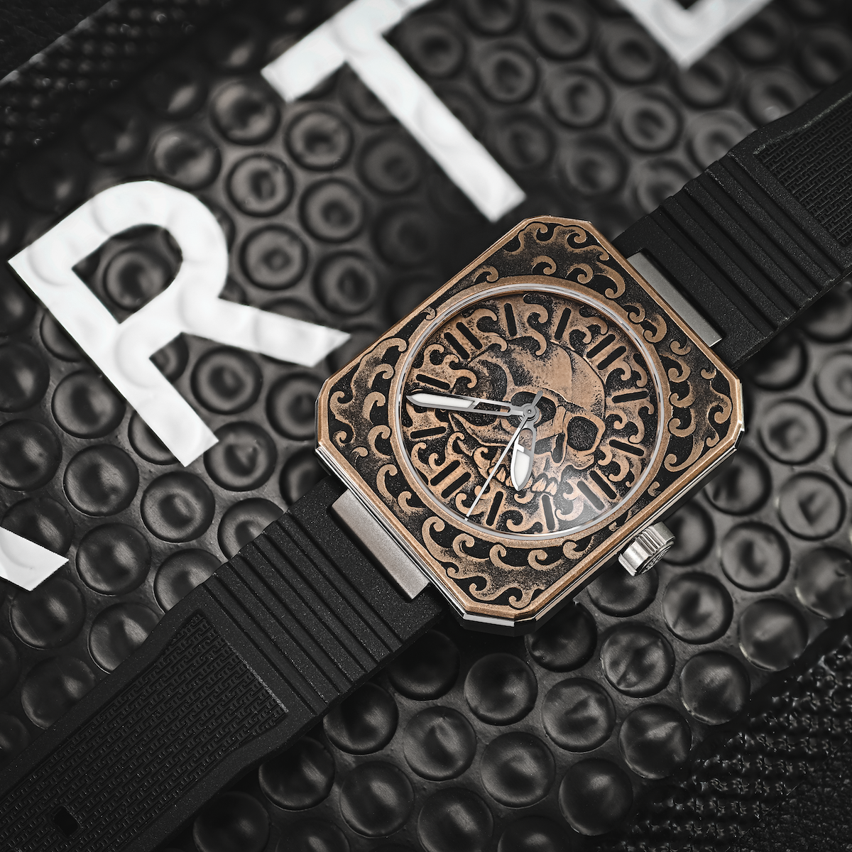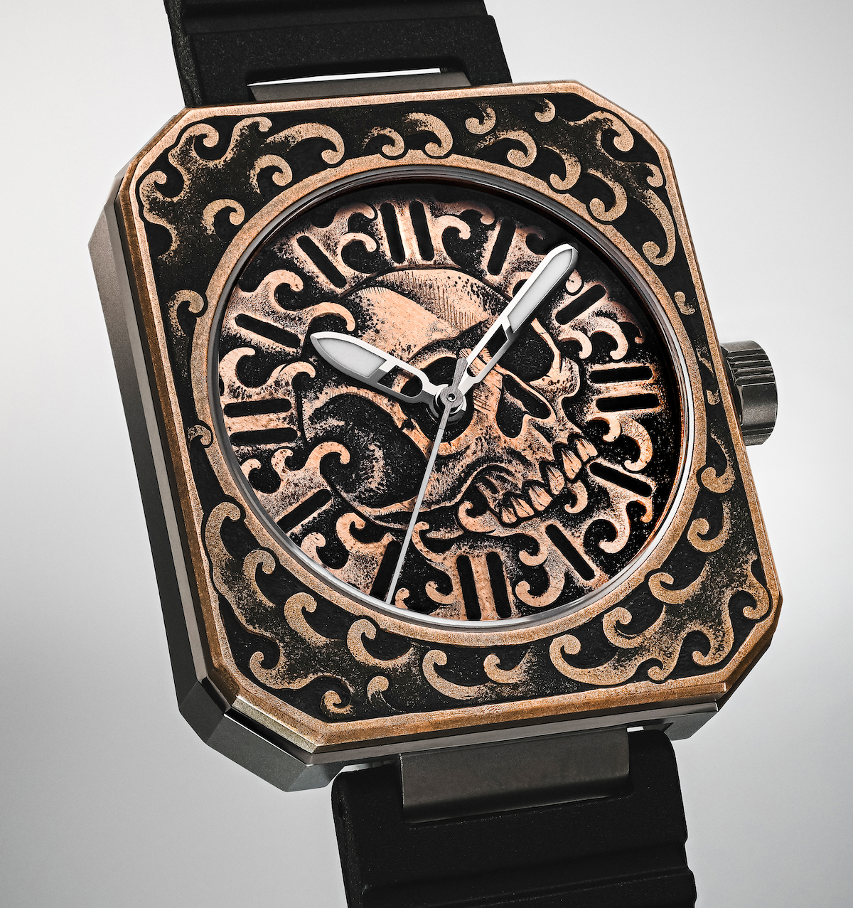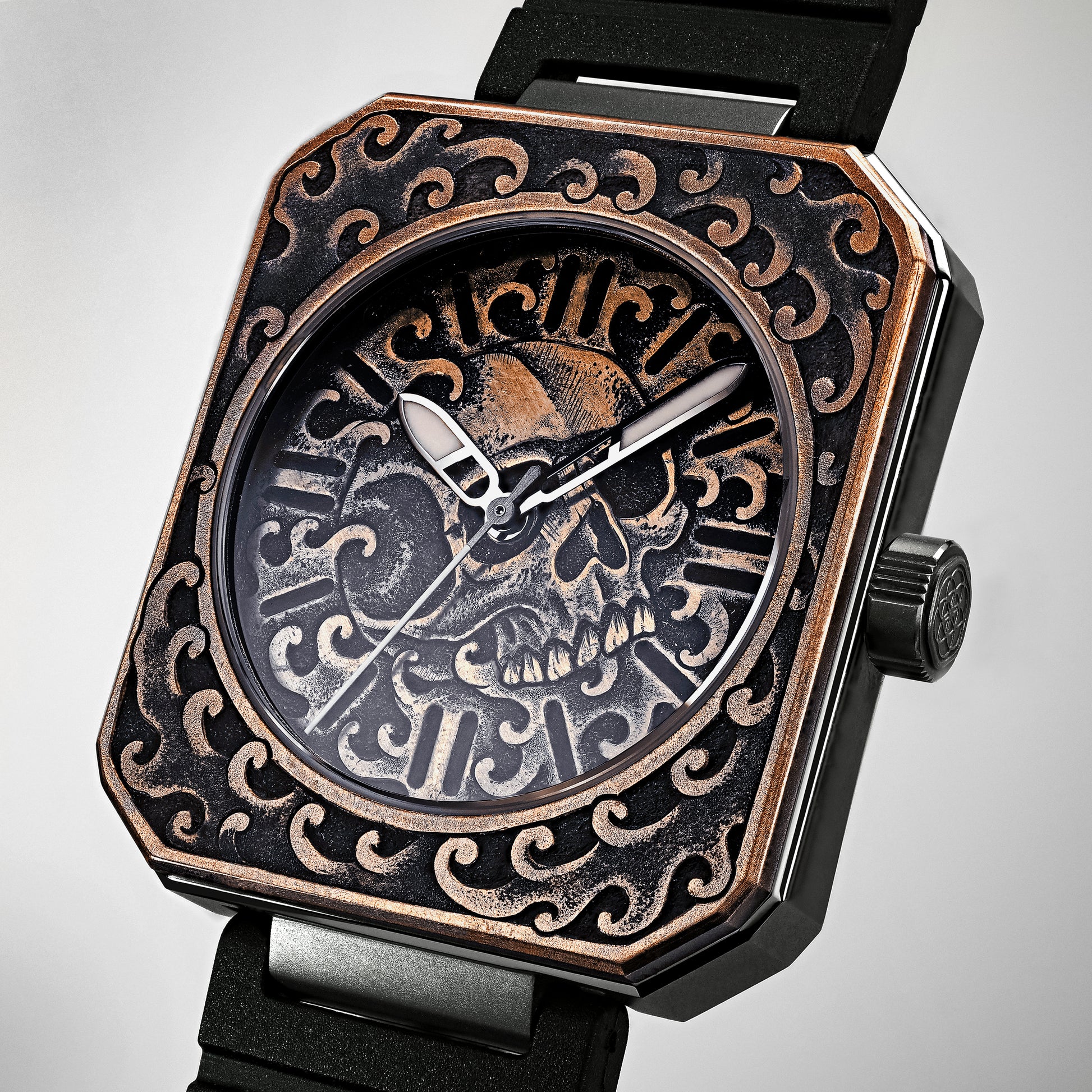 Engraver Robert Atkinson - a renowned tattoo artist and engraver based in Los Angeles - blends Western and Oriental traditions, engraving a classic tattoo-inspired skull framed by his signature crashing wave pattern. The piece brings the centuries-old tradition of Memento Mori to life on the wrist, created for a single collector.